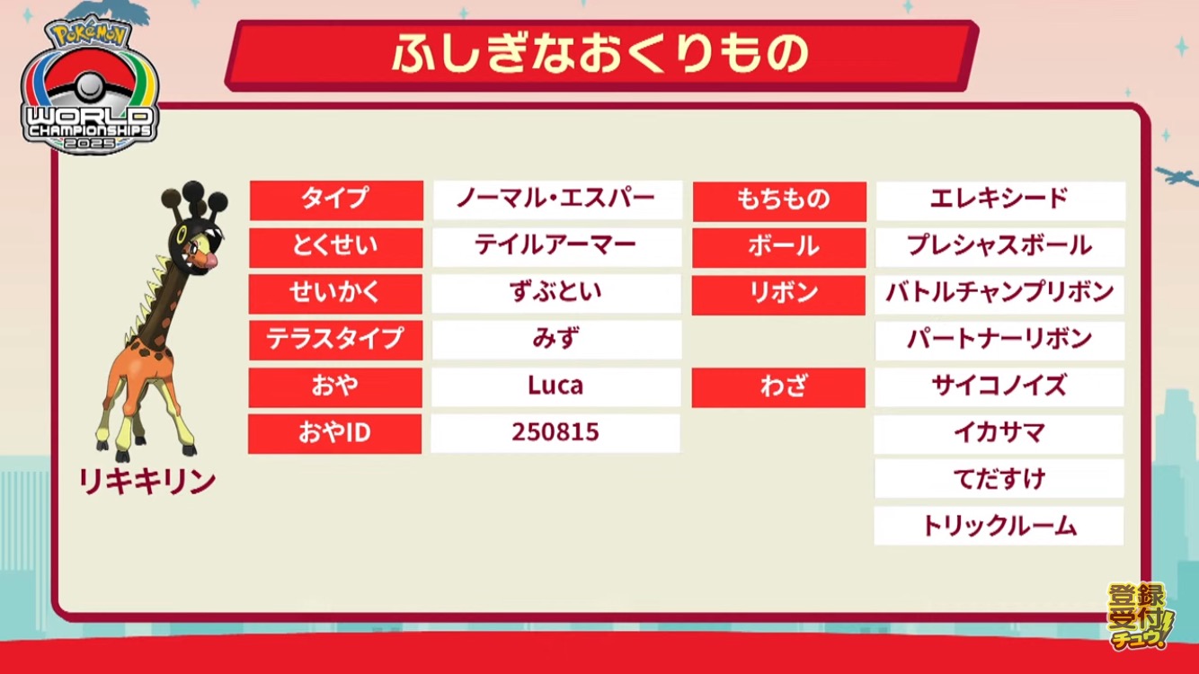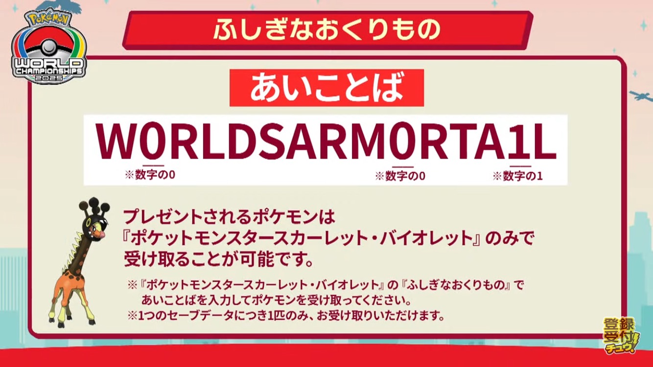 【ポケモンSV】ポケモンWCS2024で活躍したリキキリンを受け取ろう! 公開日:2025年08月18日 ユーザー:pompom ログインしてフォロー ダイレクトメッセージ リンクをコピー 報告する 『ポケモンスカーレット・バイオレット』で受け取れる「ふしぎなおくりもの」のあいことばが発表されました。受け取りコード:W0RLDSARM0RTA1L※0,1は数字ポケモン:Lucaの「リキキリン」 favorite 0 chat_bubble 0 share pompom ログインしてフォロー プロモーション