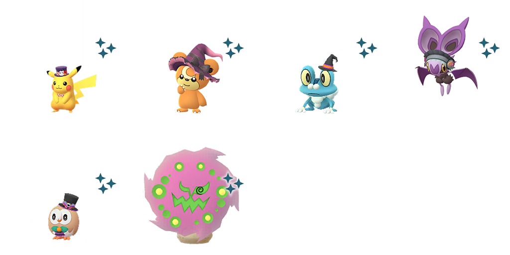 ハロウィンいたずら飾りをつけた「ピカチュウ」/魔女の帽子をかぶった「ヒメグマ」/魔女の帽子をかぶった「ケロマツ」/カチューシャをつけた「オンバット」/ハロウィン衣装をつけた「モクロー」/「ミカルゲ」