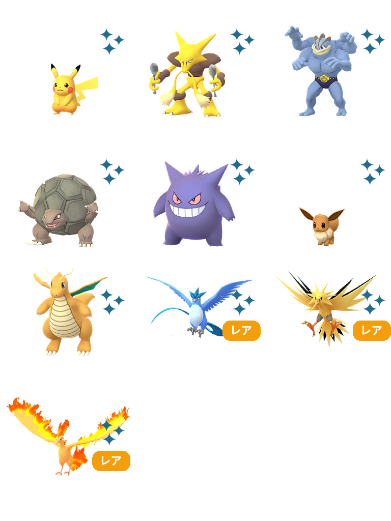 「ピカチュウ」「フーディン」「カイリキー」「ゴローニャ」「ゲンガー」「イーブイ」「カイリュー」など、カントー地方で最初に発見されたポケモンのポケモンの生息地に合った場所で出会うことができます!とても運が良ければ、「フリーザー」「サンダー」「ファイヤー」と出会えるかもしれません。