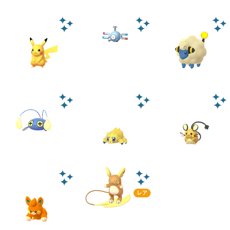 「でんきショック?」イベントが開催されます。でんきタイプのポケモンが多く登場し、色違いの「ピカチュウ」「チョンチー」「デデンネ」に出会いやすくなります。