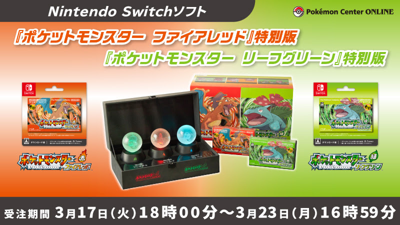 特別版「ファイアレッド」「リーフグリーン」が明日受注開始pompom2026年3月16日「ポケットモンスター ファイアレッド」と「ポケットモンスター リンハーフグリーン」の各特別版が、明日3月17日(火)18:00より受注販売が開始されます。「ポケットモンスター ファイヤレッド」特別版「ポケットモンスター リーフグリーン」特別版注意:お届けは2027年1月ごろになるようです。関連#ポケモン#ポケモングッズ#最新情報favorite0chat_bubble_outline0sharepompomポケモンが好き 面白いと思ったら、なんでも発信していきまーす♪