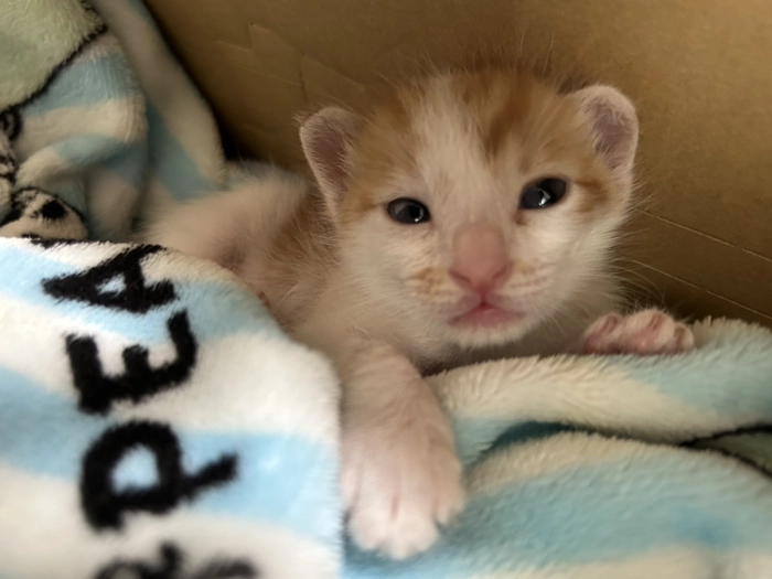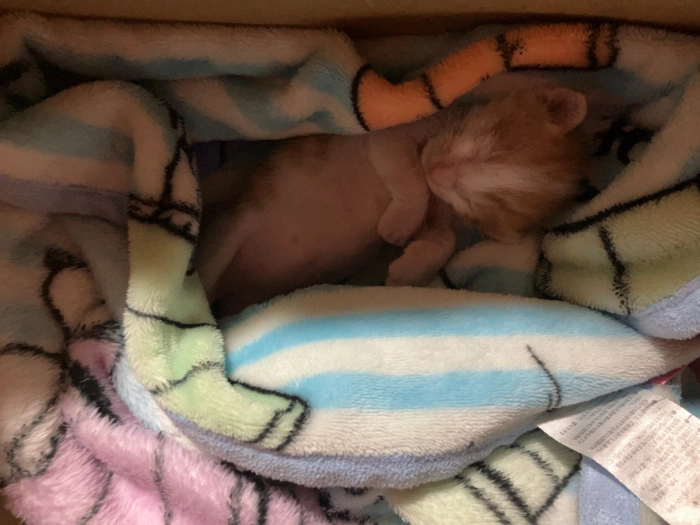 段ボール箱にブランケット、湯たんぽ、タオルを入れて、冷やさないようにしています!